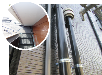 破風板、軒天、雨樋、霧除け、面格子など外壁工事に付帯している部分の塗装を行います。付帯部分も外壁同様カビや変色、劣化がみられることが多いので下地処理後、付着性に優れた塗料で丁寧に刷毛塗りをしていきます。ガイソーではこの工程を2回行います。